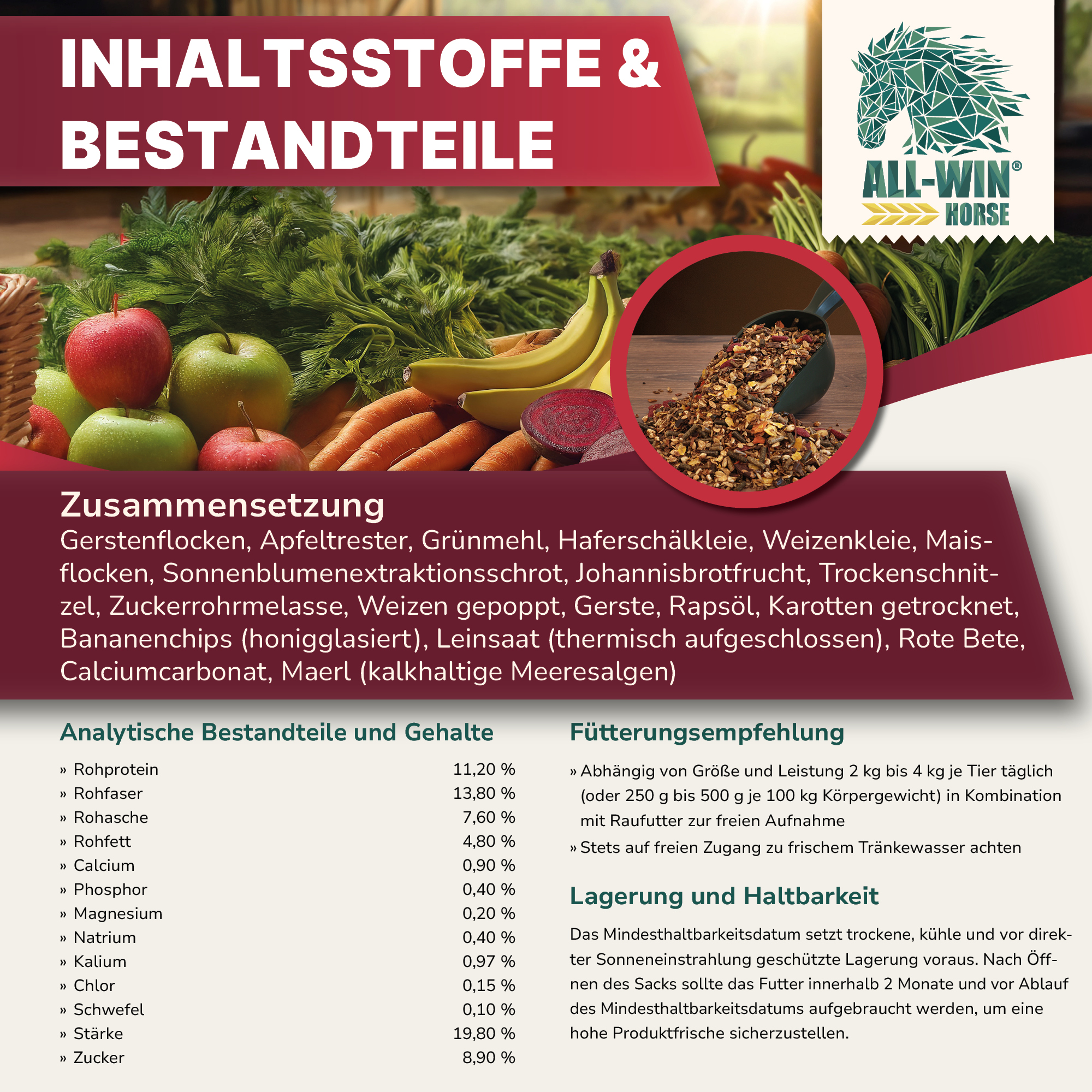 Inhaltsstoffe: Gerstenflocken, Apfeltrester, Grünmehl, Haferschälkleie, Weizenkleie, Maisflocken, Sonnenblumenextraktionsschrot, Johannisbrotfrucht, Trockenschnitzel, Zuckerrohrmelasse, Weizen gepoppt, Gerste, Rapsöl, Karotten getrocknet, Bananenchips (honigglasiert), Leinsaat (thermisch aufgeschlossen), Rote Bete, Calciumcarbonat, Maerl (kalkhaltige Meeresalgen)