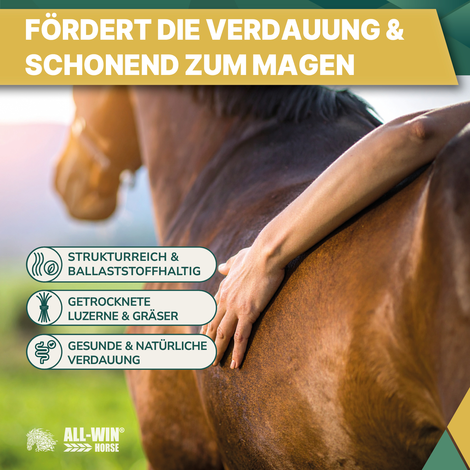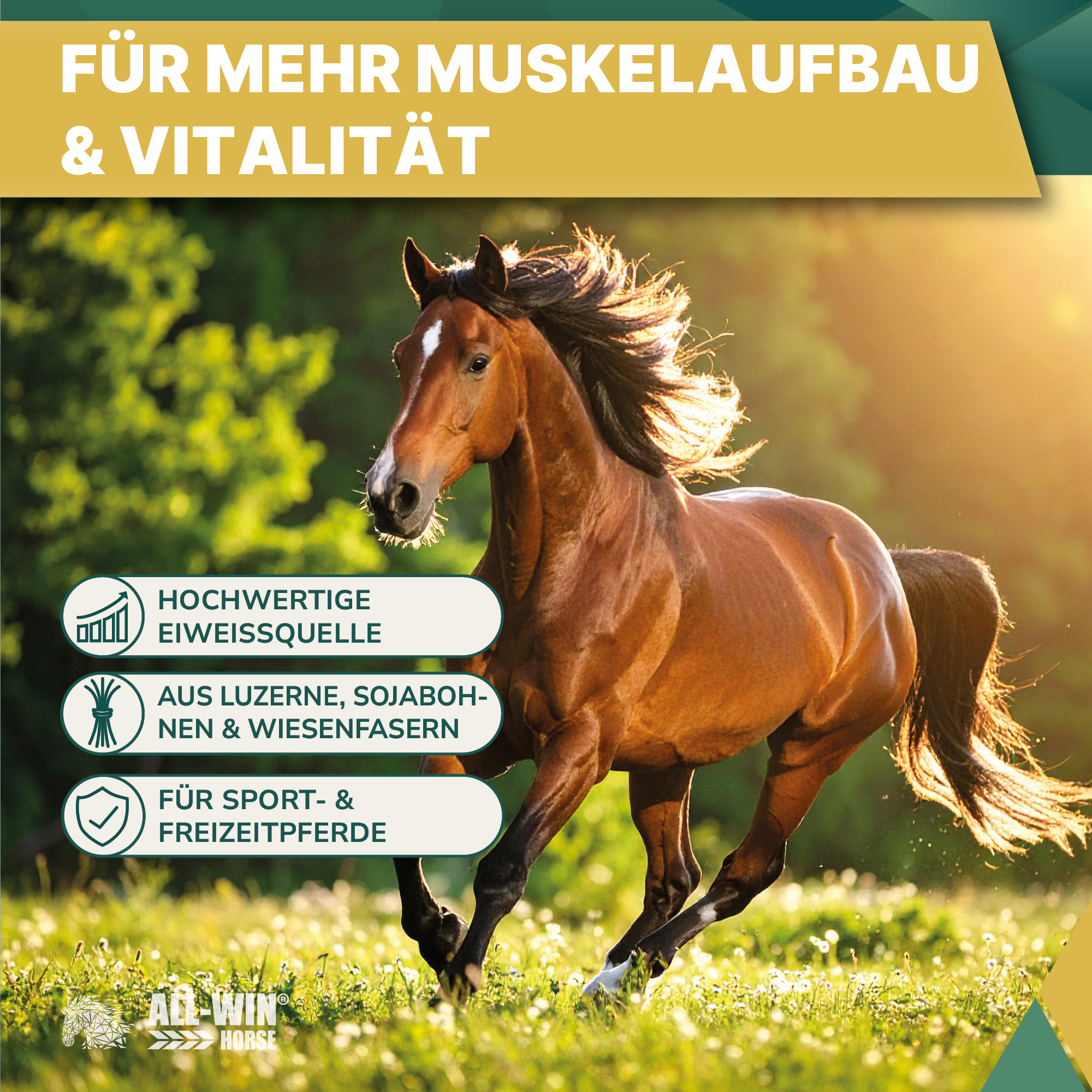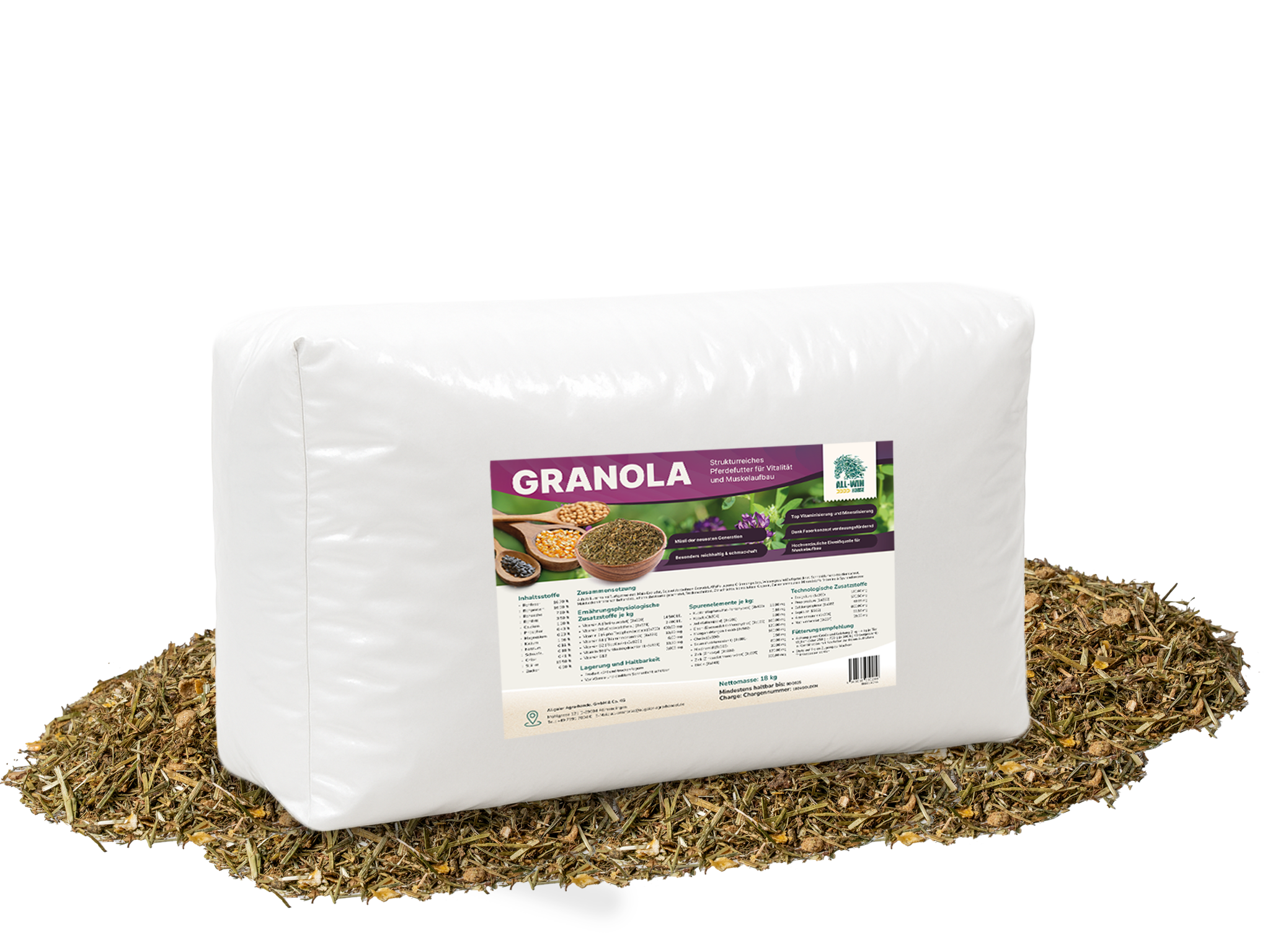 ALL-WIN® Horse Granola ist ein innovatives, haferfreies Ergänzungsfuttermittel für Pferde, das gezielt Vitalität, Muskelaufbau & Futterakzeptanz fördert. Es überzeugt durch eine hochwertige Zusammensetzung mit Luzerne, Soja, Wiesenfasern und Zitrusfrüchten.