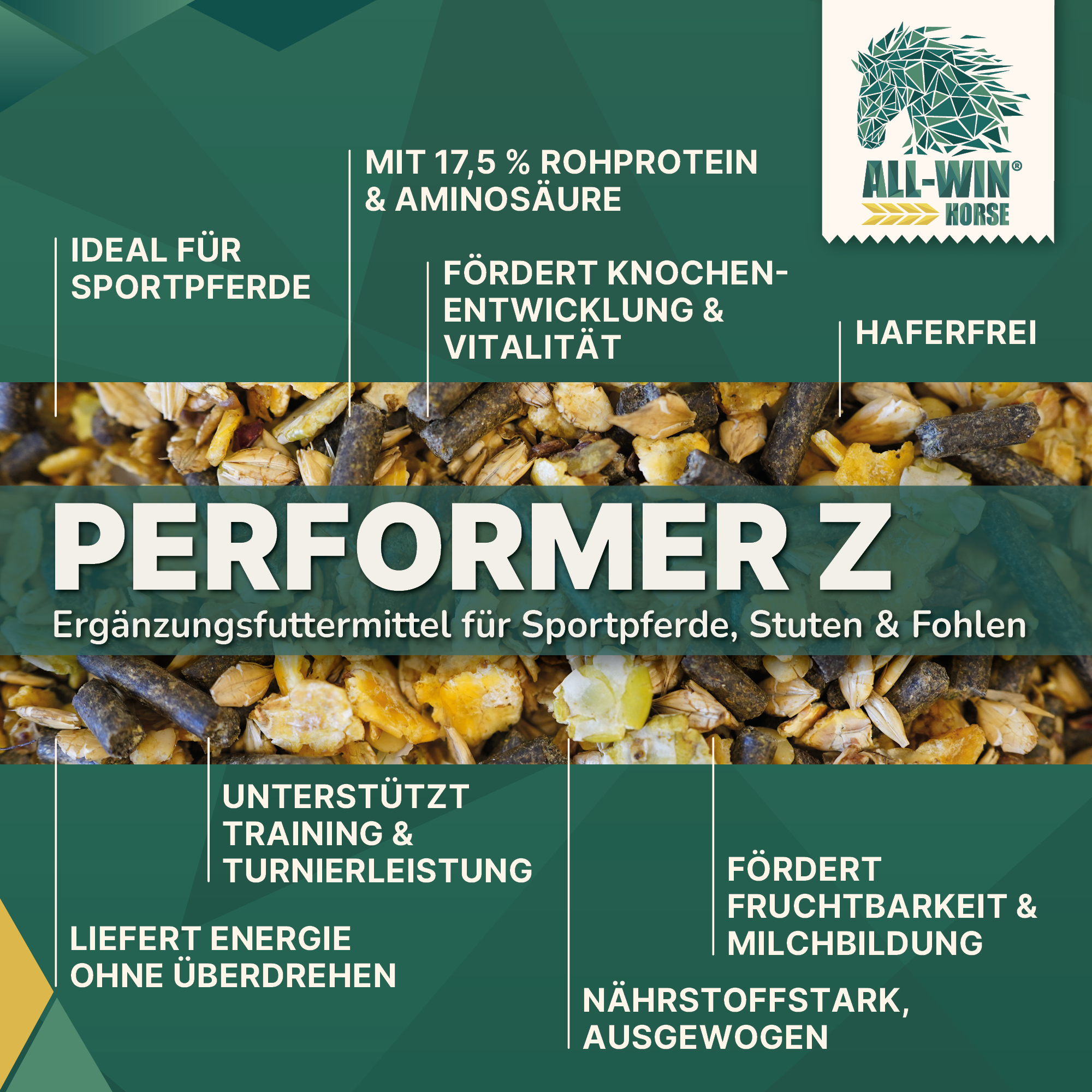 ALL-WIN® Horse Performer Z ist ein leistungsstarkes Aufbau- und Kraftfutter für Sportpferde, Zuchtstuten und Jungpferde. Durch das ausbalancierte Protein-Energie-Verhältnis und wertvolle Aminosäuren unterstützt es effektiv Muskelaufbau, Leistungsfähigkeit und Vitalität.