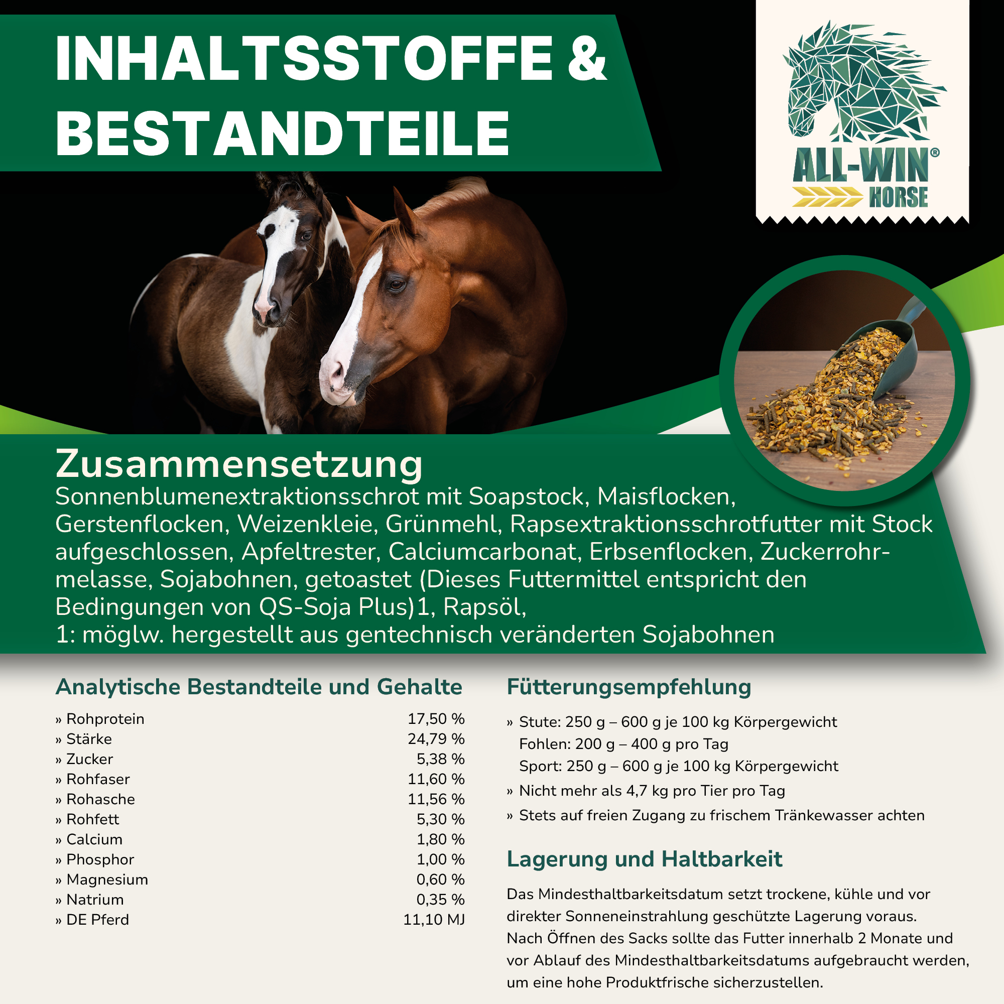 Inhaltsstoffe: Sonnenblumenextraktionsschrot mit Soapestock, Maisflocken, Gerstenflocken, Weizenkleie, Grünkern, Rapsextraktionsschrotfutter mit Stock aufgeschlossen, Apfeltrester, Calciumcarbonat, Erbsenflocken, Zuckerrohrmelasse, Sojabohnen, getoastet (Dieses Futtermittel entspricht den Bedingungen von QS-Soja Plus¹), Rapsöl, ¹: möglw. hergestellt aus gentechnisch veränderten Sojabohnen