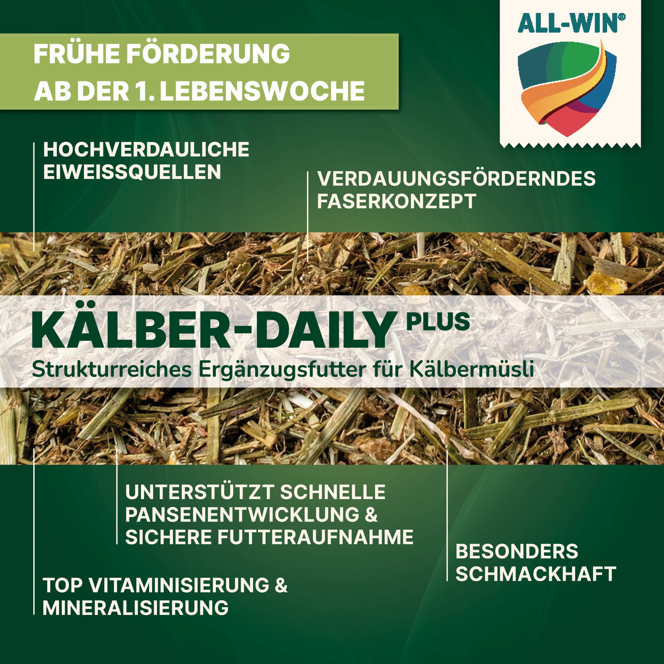 ALL-WIN® Kälber Daily Plus ist ein modernes, strukturreiches Ergänzungsfutter für die frühe Kälberaufzucht. Die hochwertige Müsli-Rezeptur kombiniert hochverdauliche Eiweißquellen, wertvolle Fasern sowie eine intensive Vitamin- und Mineralstoffversorgung.