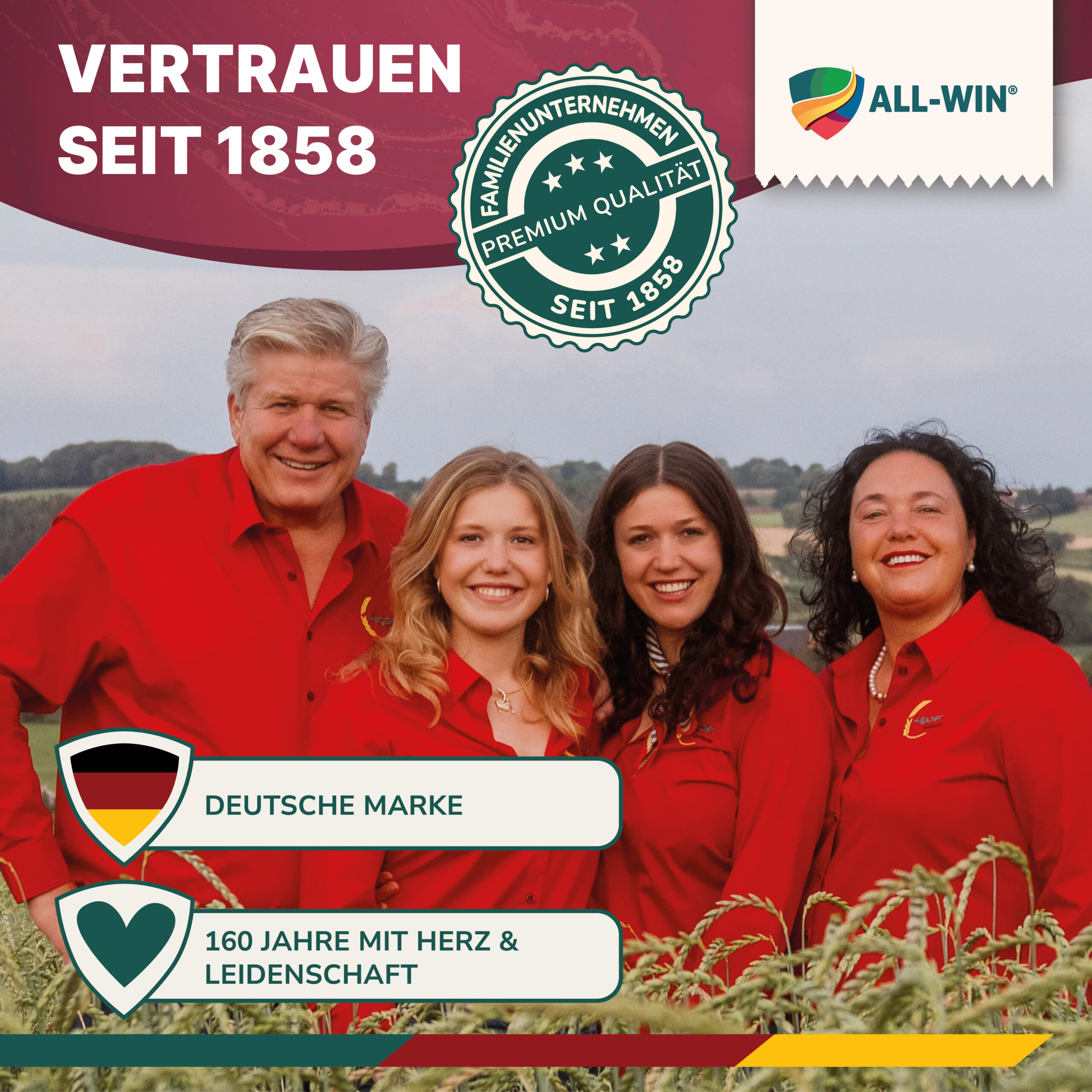 Aus dieser Erfahrung und Verbundenheit entstand unsere Eigenmarke ALL-WIN®. Mit ALL-WIN® haben wir Futtermittel und Fütterungskonzepte entwickelt, die höchsten Qualitätsstandards entsprechen und sich in der Praxis bewähren. Dabei setzen wir auf aktuelle Erkenntnisse und die enge Zusammenarbeit mit Landwirtinnen und Landwirten.
