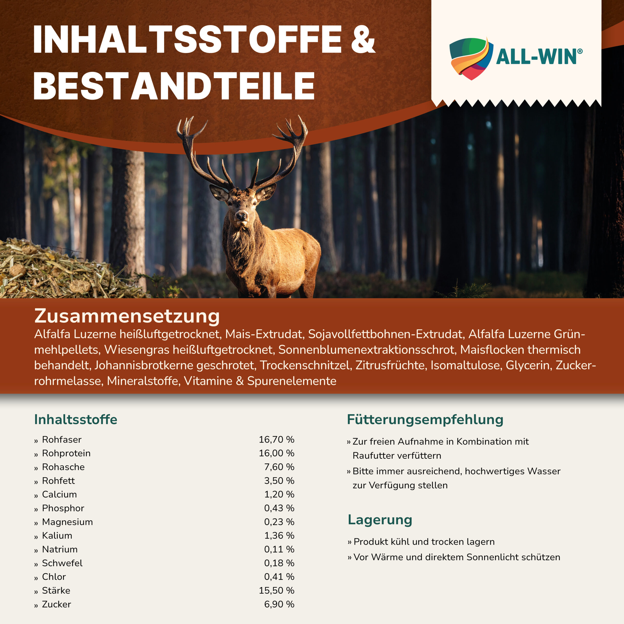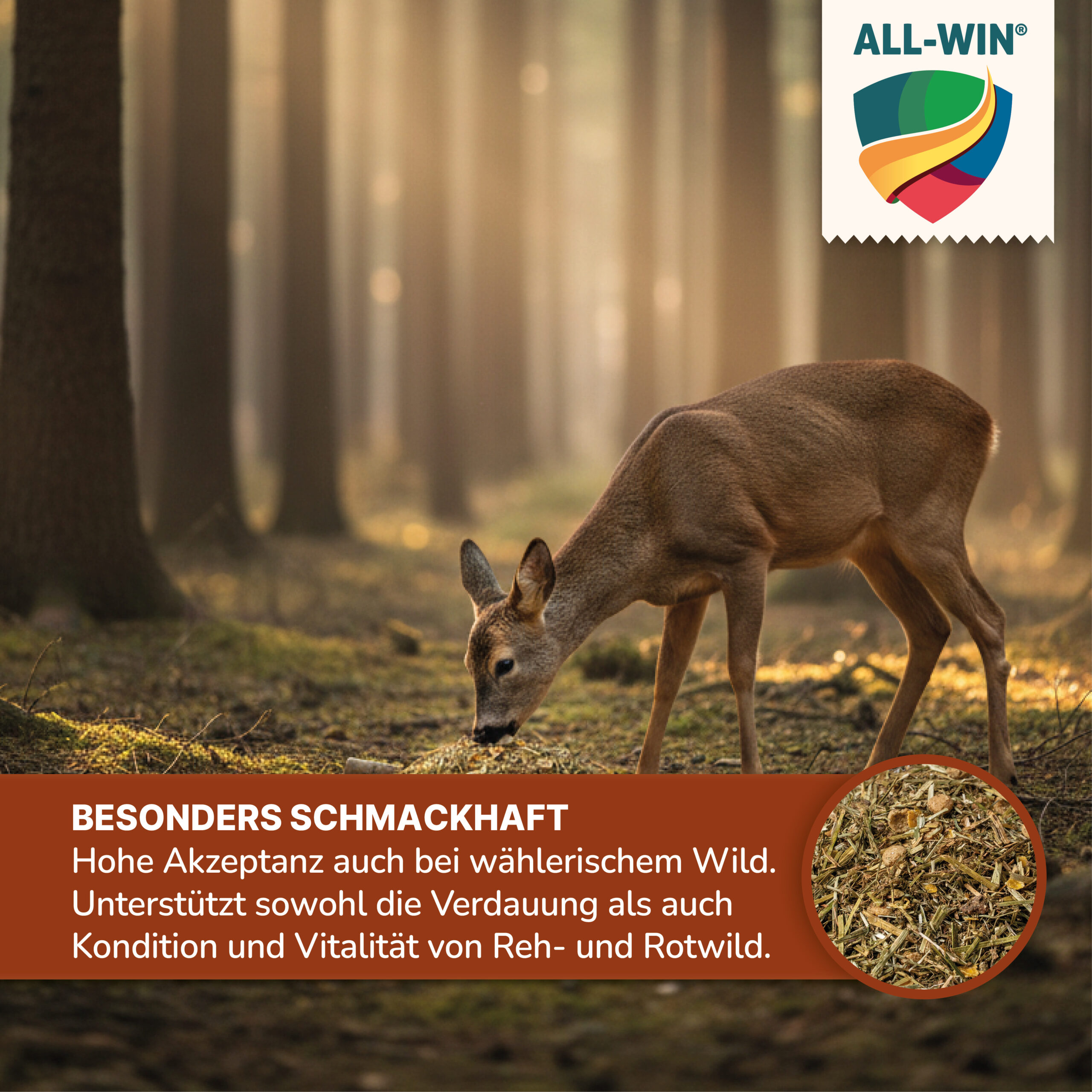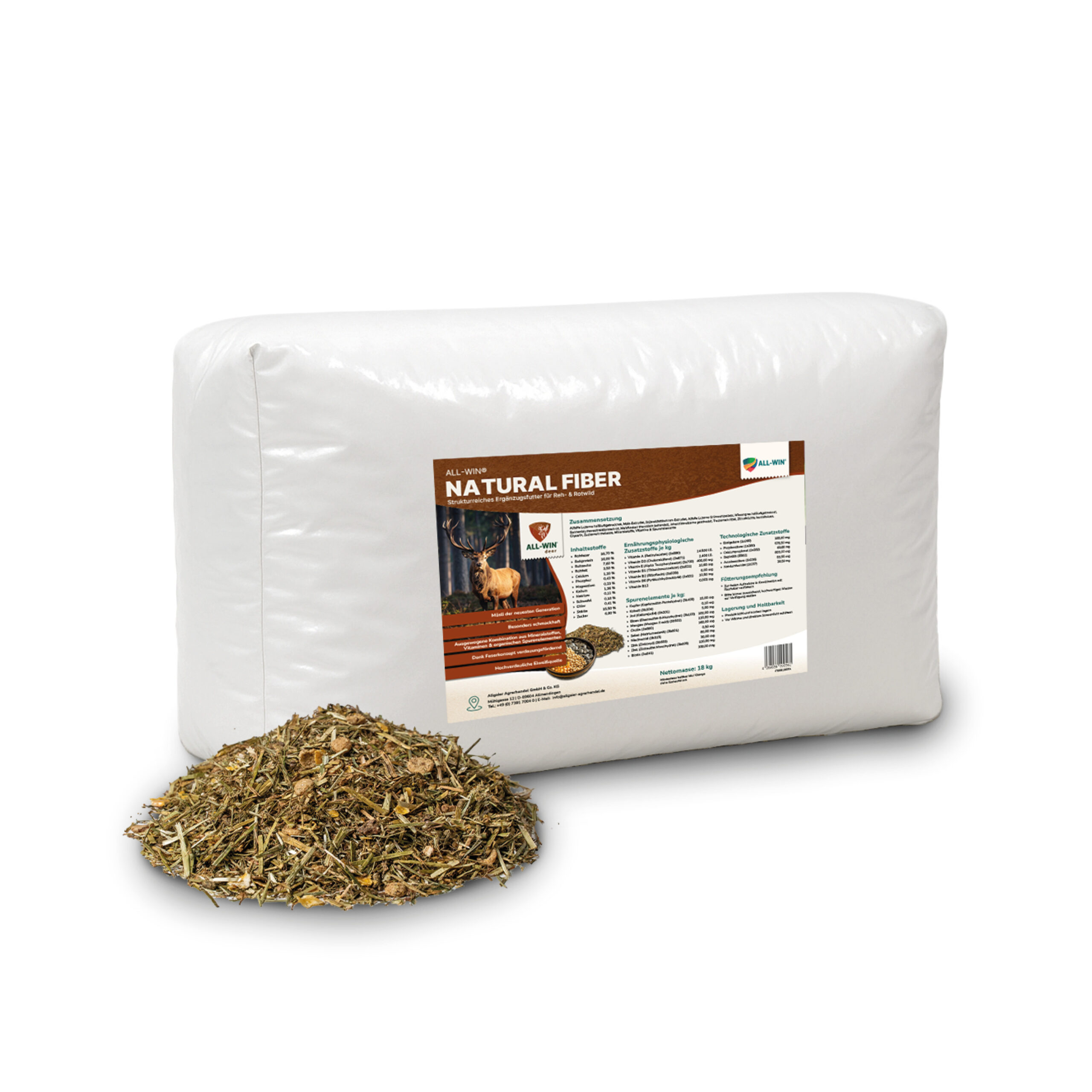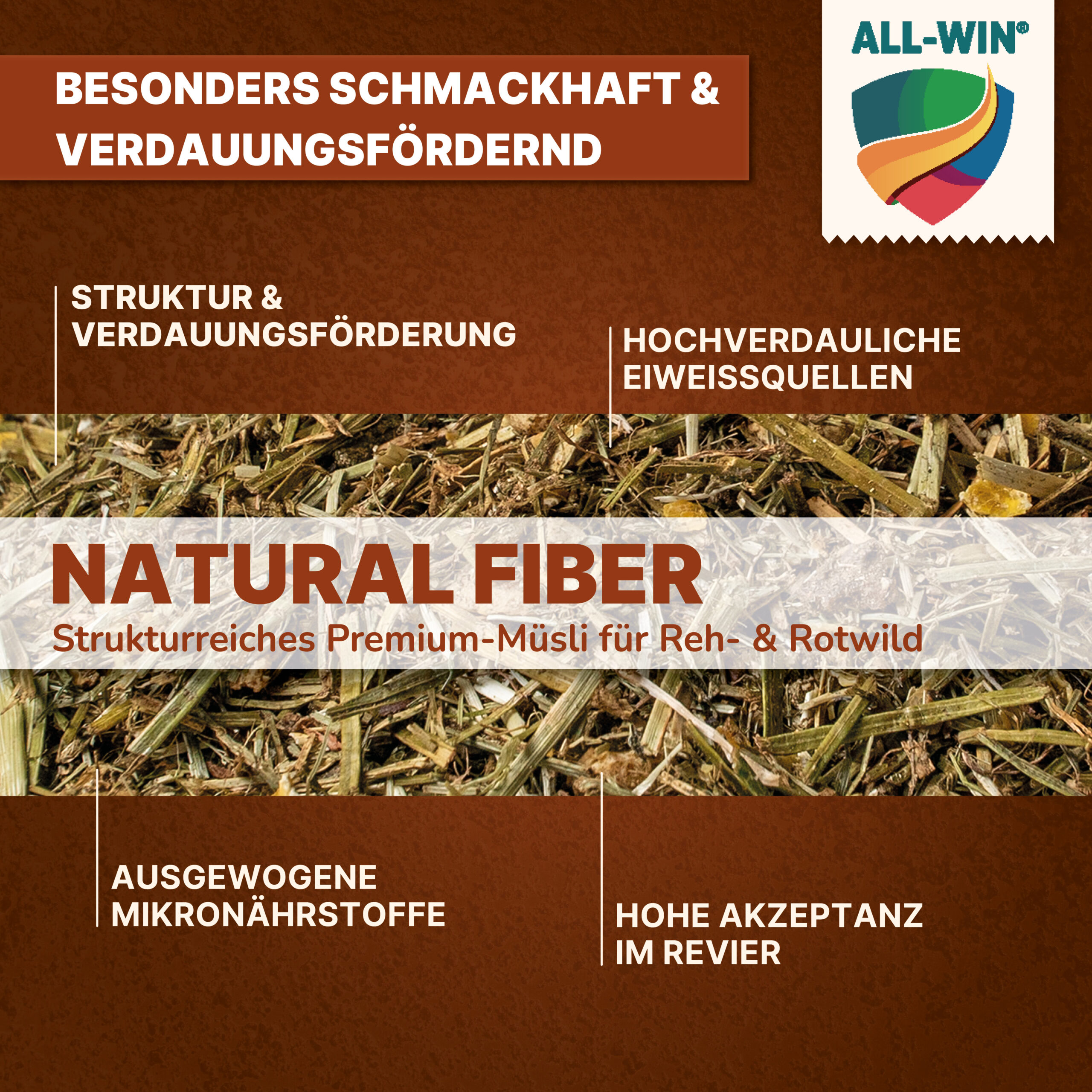 ALL-WIN® Natural Fiber ist ein strukturreiches Premium-Ergänzungsfutter für Reh- und Rotwild. Die moderne Müsli-Rezeptur kombiniert hochwertige Fasern, gut verfügbare Proteine sowie Vitamine und organische Spurenelemente für eine artgerechte Wildfütterung.