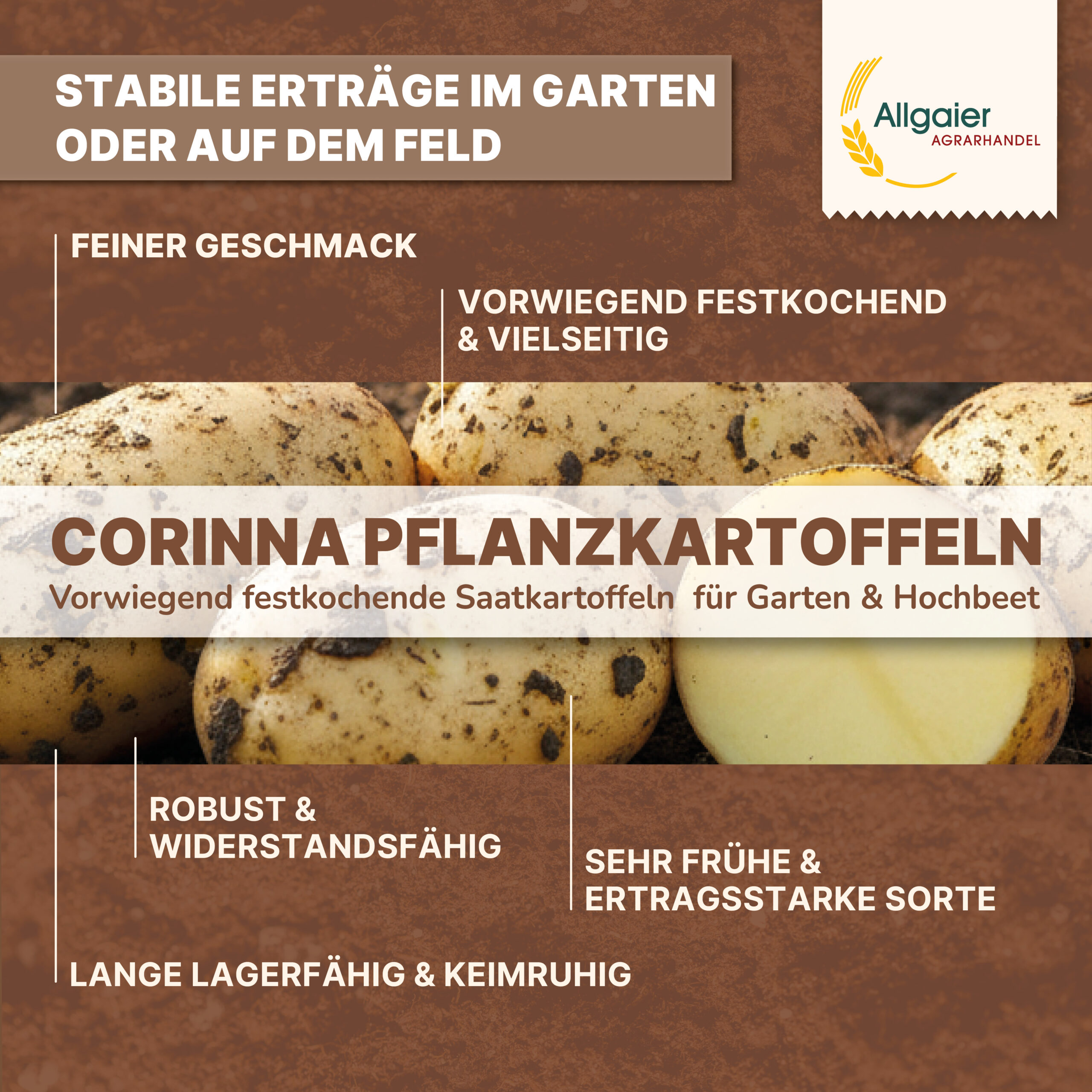 Corinna gehört zu den besonders früh reifenden Saatkartoffeln und liefert gleichzeitig große und zuverlässige Erträge. Damit eignet sie sich ideal für Hobbygärtner sowie für den professionellen Kartoffelanbau.
